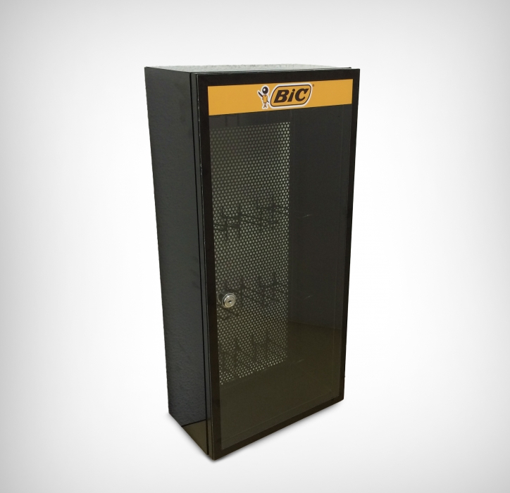 Projeto de display de balcão desenvolvido em chapa perfurada para que fosse possível a modulação dos ganchos, sendo assim possível acomodar toda a linha de embalagens do cliente. Os ganchos também possuem parafusos para que sejam presos ao display, dificultando assim o furto dos mesmos.